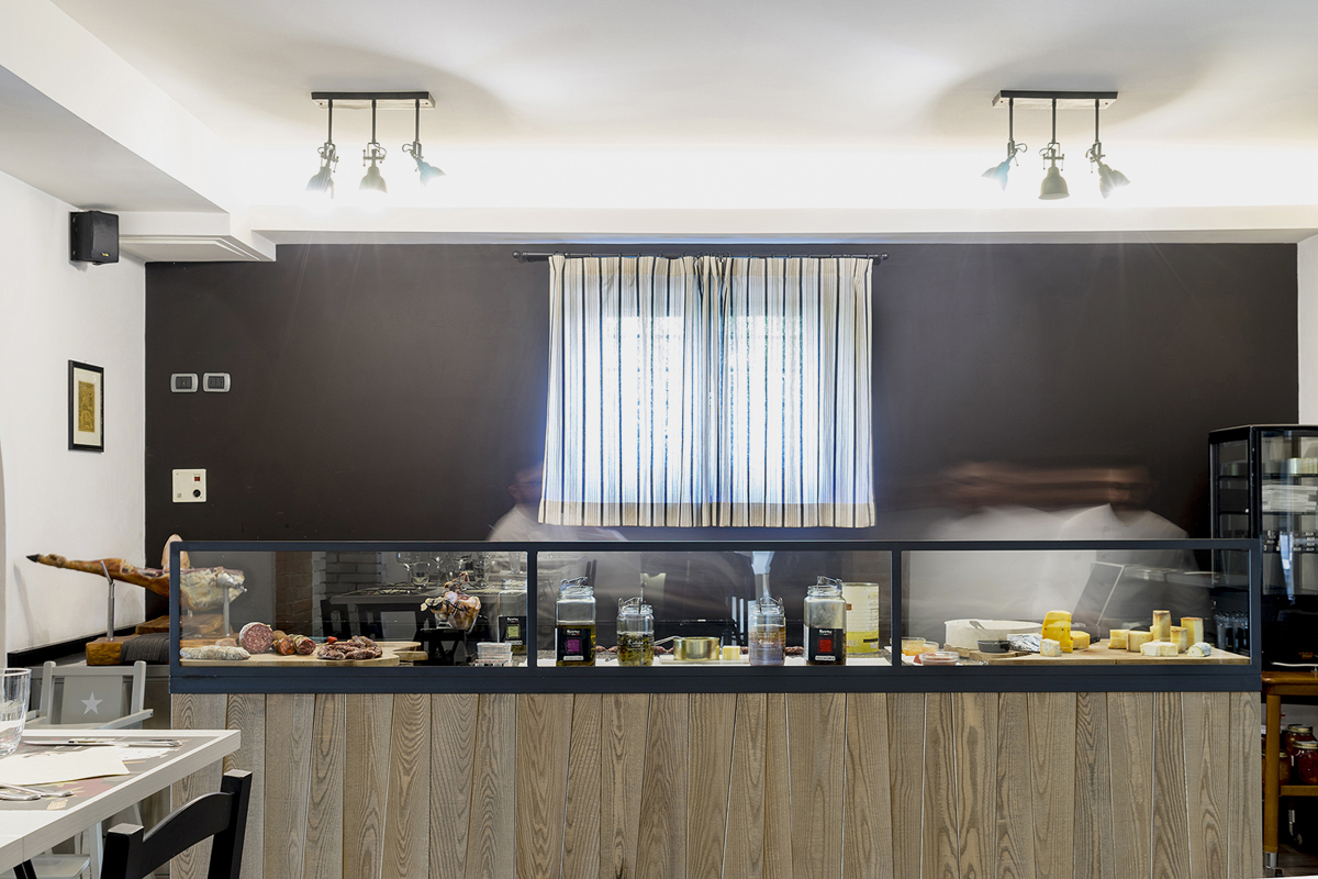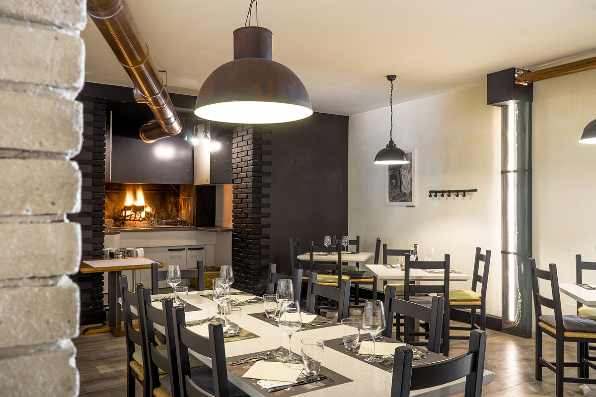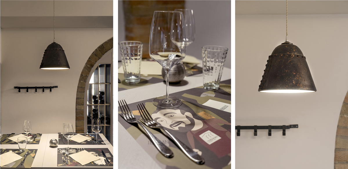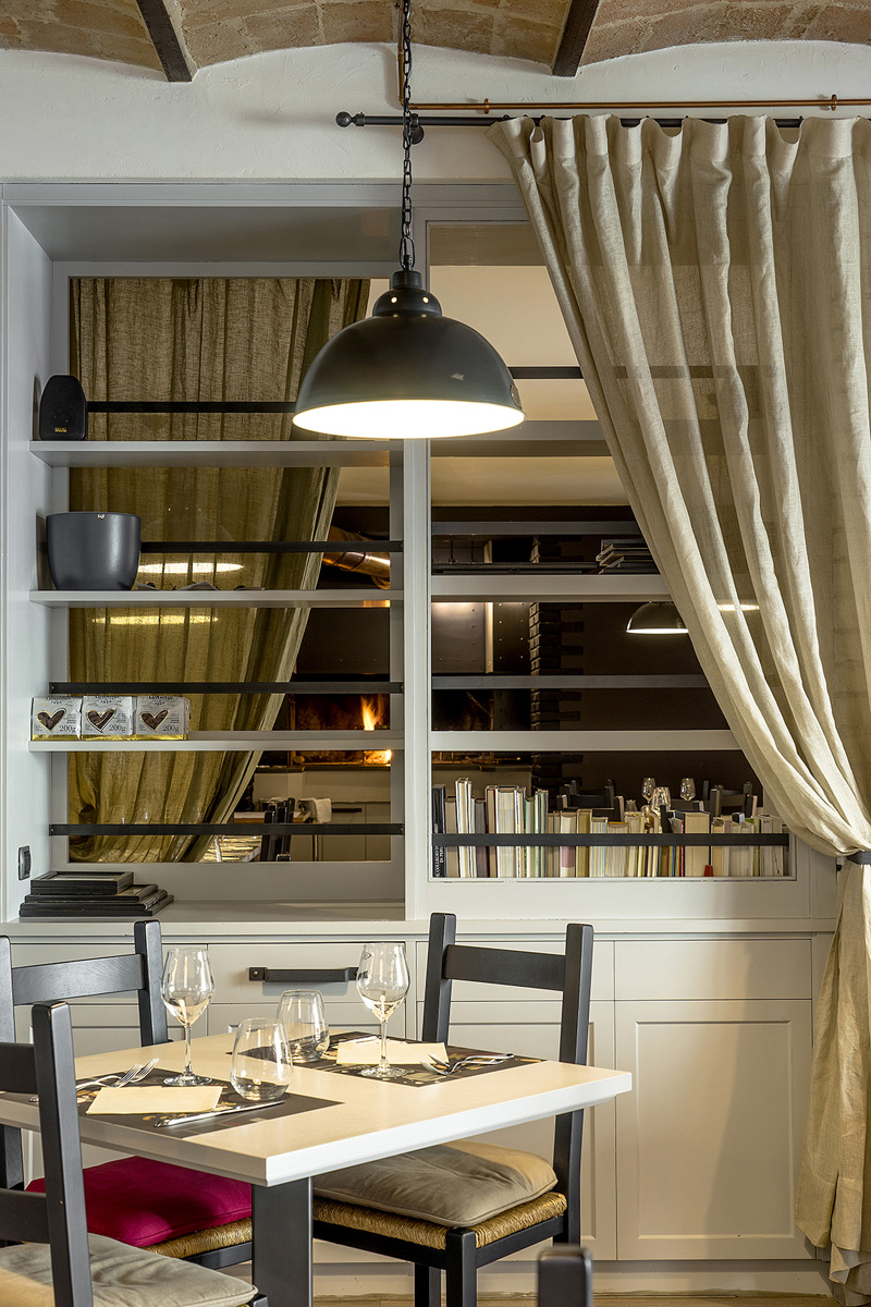 Immagine fresca e nuova? Contrasti, pochi (ma buoni) colori, luce giusta e materiali misti in un continuo equilibrio fra caldo e freddo. Legno, ferro e tessuti assecondano le preesistenze sia nell’essenza materica che nel linguaggio dei colori. Gli infissi in ferro scuro, le vetrate colorate, i mattoni e il legno dei soffitti hanno dettato la linea di uno stile industriale pulito e conformato alle esigenze del locale. Per l’Osteria del Bosco ho disegnato anche gli appendiabiti, i tavolini alti, il bancone dei salumi, il camino e molti altri dettagli.