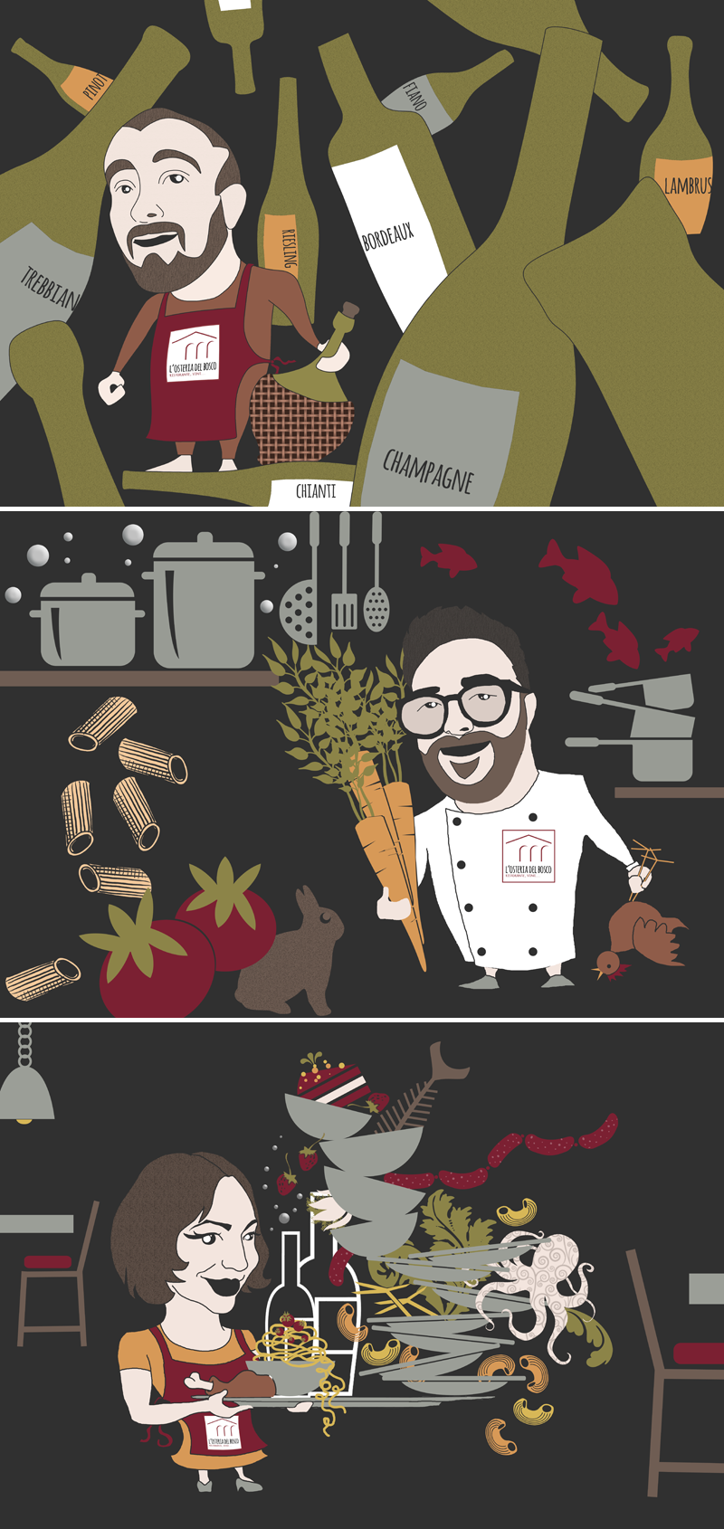 Le tovagliette e i menu sono stati il passo successivo del restyling. Immagine fresca e nuova… e un pizzico di ironia. Perché quando si mangia si sorride volentieri, e quando si sorride, si mangia volentieri. Caricature: l’oste, la moglie, il cuoco. Stesso tema per i menu, nei quali appaiono caduti alla rinfusa alcuni degli ingredienti rappresentati sulle tovagliette.